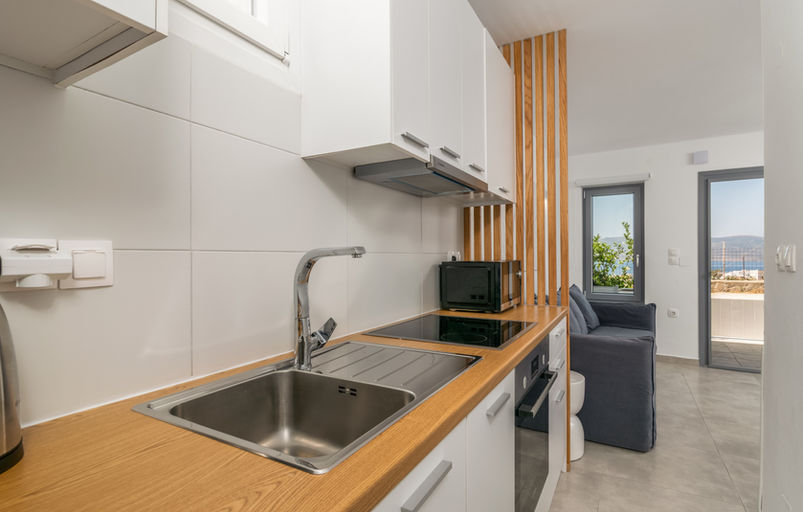 Nestled on the ground floor, The Suite offers charming views of the local road, as well as the beautiful bay of the island and Adamas village. This inviting accommodation features a separate bedroom, a modern bathroom, and a fully equipped kitchen with a refrigerator, oven, stove, Nespresso coffee machine, kettle, toaster, dishes and silverware, pots and pans. Relax in the cozy, bright living room, providing you with a perfect space for privacy and comfort.